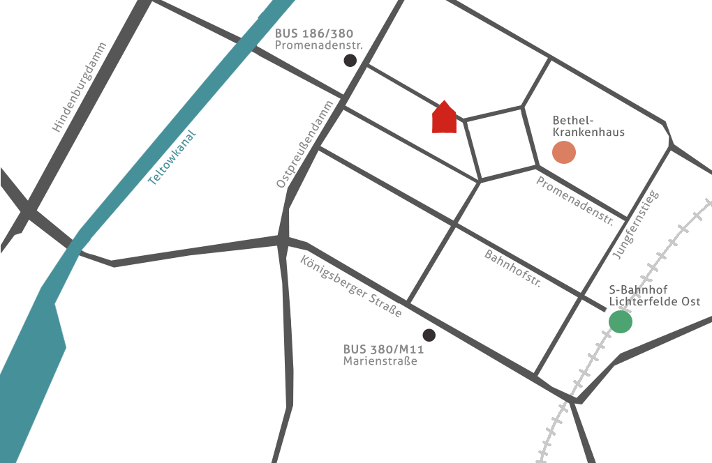 Sie können auch die Busse 186 oder 380 bis Promenadenstraße, oder die 380 oder M11 bis Marienstraße nehmen. Für den Weg von der Bushaltestelle ins Menno-Heim orientieren Sie sich an der Karte oben.