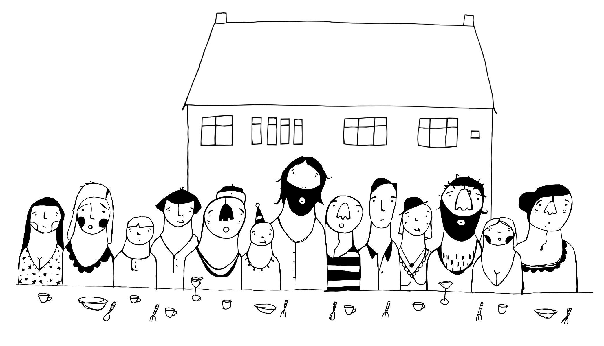 Dieses Bild hat der Künstler Nic Blokk für uns gemalt. Im Hintergrund steht unser geliebtes Menno-Heim, ein Haus für Viele. Im Vordergrund das Abendmahl in klassischer Aufteilung: Jesus in der Mitte umgeben von seinen Zwölf, aufgereiht wie an einer Perlenkette. Der Unterschied zu gängigen Darstellungen ist, dass bei unserem Bild nicht die übliche Männerrunde am Tisch sitzt, sondern eine Gruppe ganz unterschiedlicher Menschen. Männer, Frauen, Kinder, was auch immer. Heiter, staunend, grummelnd, seltsam, fröhlich. Dieses Bild steht dafür, dass in der Gemeinschaft Jesu alle Menschen einen Platz haben. Alle sind berufen zu einer neuen Gemeinschaft mit Gott und miteinander. Die Gemeinde Gottes besteht aus Menschen wie Du und Ich, die gemeinsam der neuen Welt Gottes entgegen gehen.